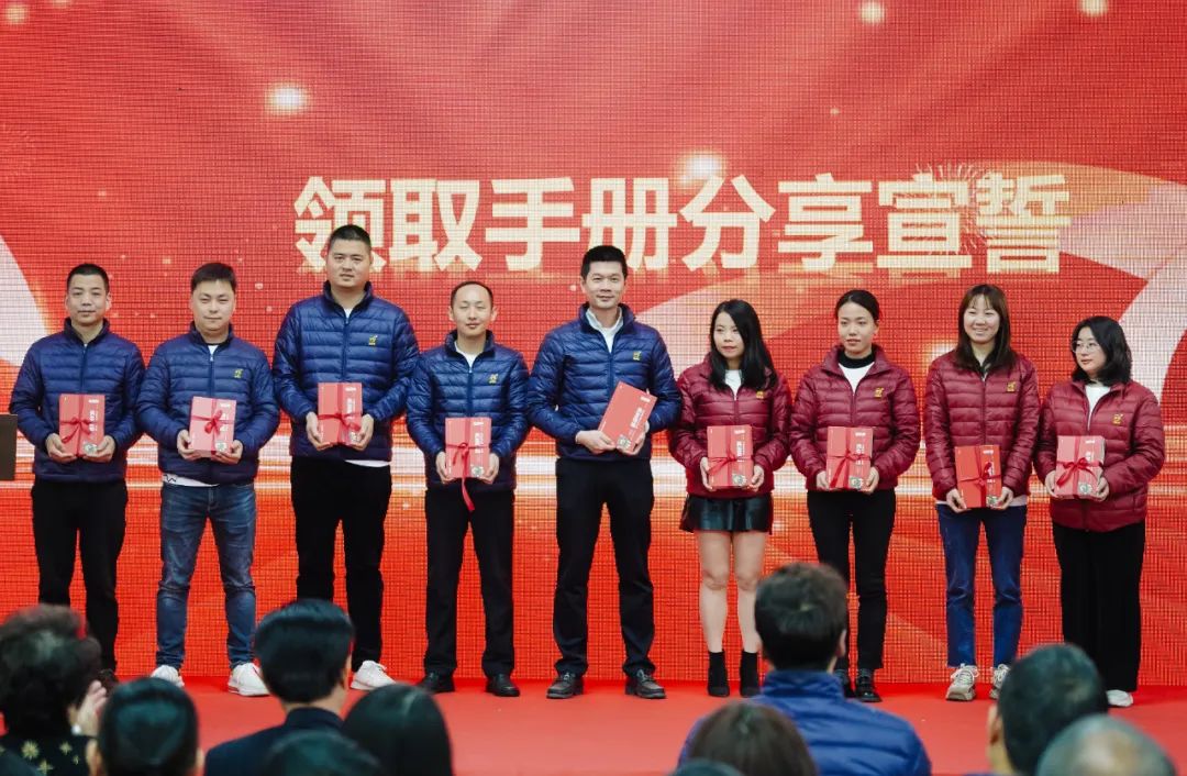 企业文化项目组成员的上台领取手册,分享宣誓并回顾编写过程。