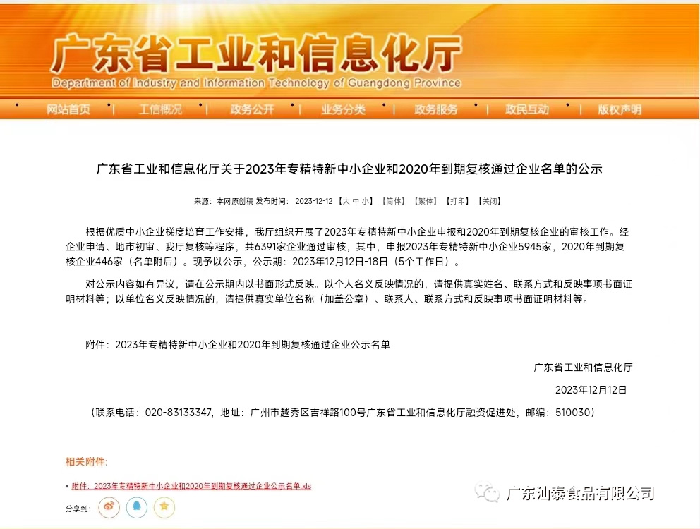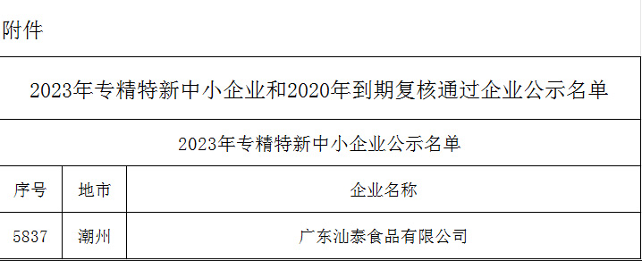 根据工业和信息化部《广东省优质中小企业梯度培育管理实施细则》有关要求,广东省工业和信息化厅组织开展广东省“专精特新”中小企业申报认定工作,广东汕泰食品有限公司被广东省工业和信息化厅认定为2023年度“广东省专精特新中小企业”荣誉称号,有效期自公布起三年之内。